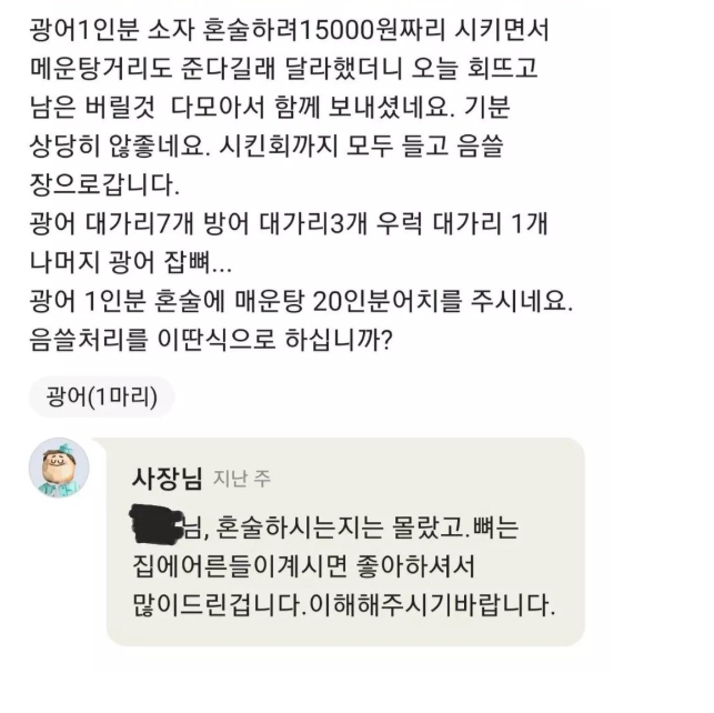 광어 1인분을 시켰는데 매운탕 20인분을 보내버린 횟집..