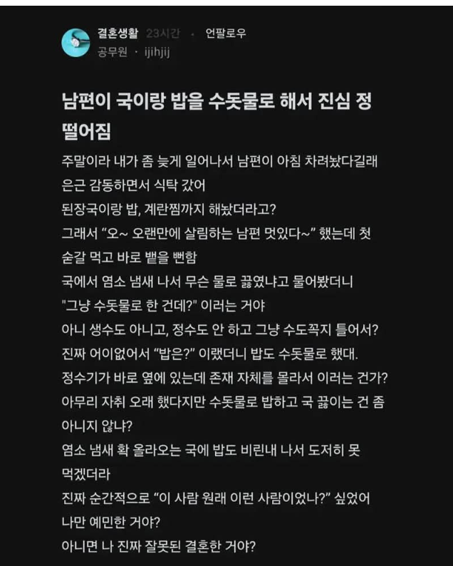 남편이 수돗물로 국 끓여서 염소냄새 난다고 화난 아내..