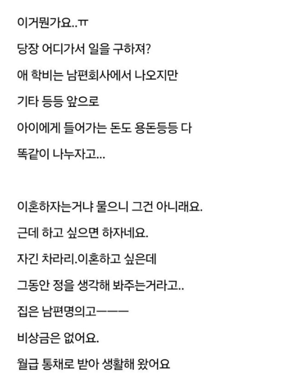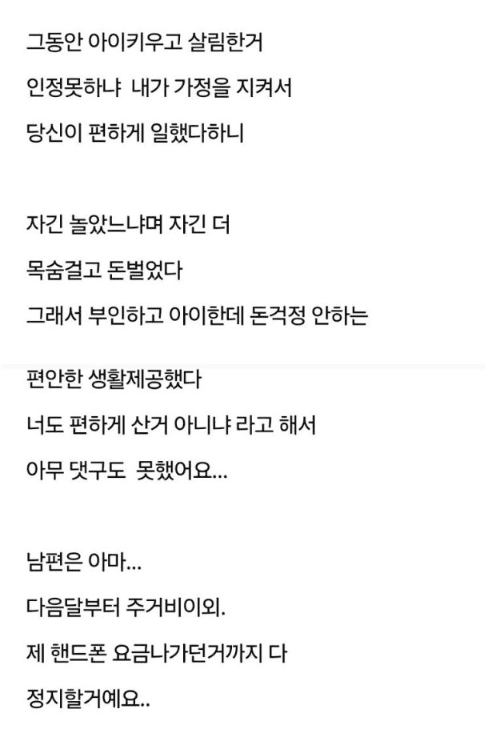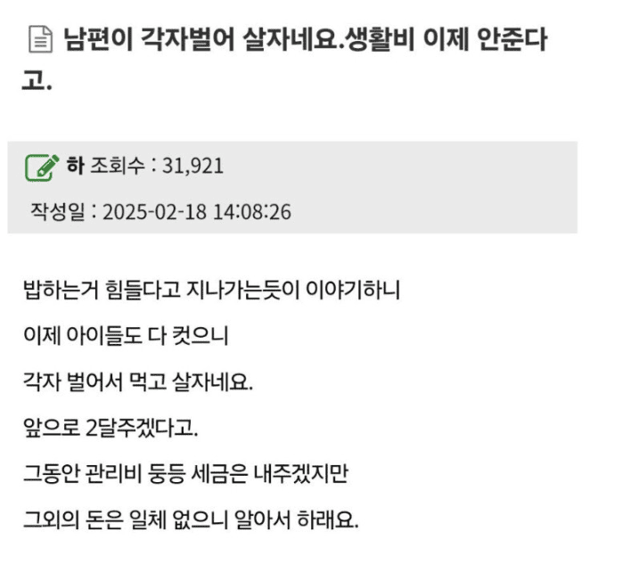 남편이 이제 각자벌어서 살자네요 생활비 안준다고..