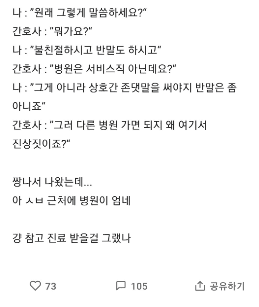 병원에서 간호사가 반말하길래 나왔어..