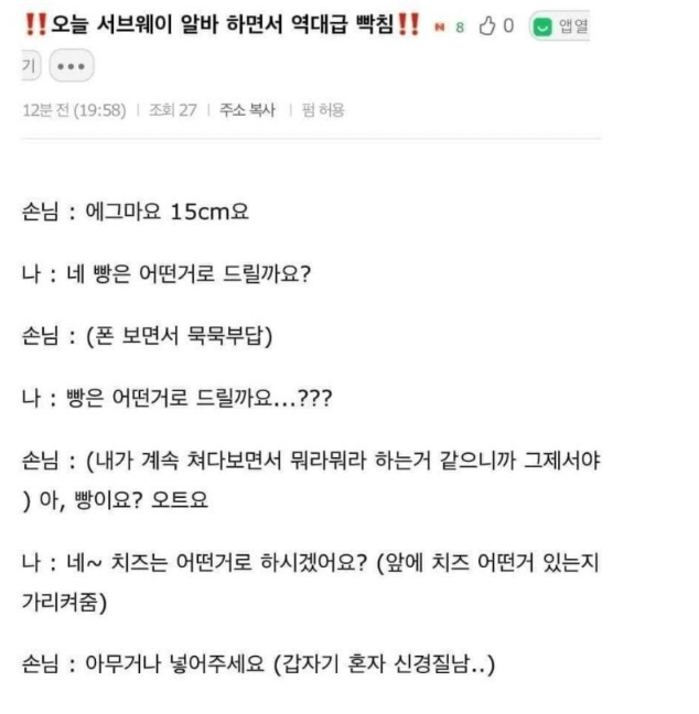 서브웨이 알바하는데 역대급 ㅃ침..