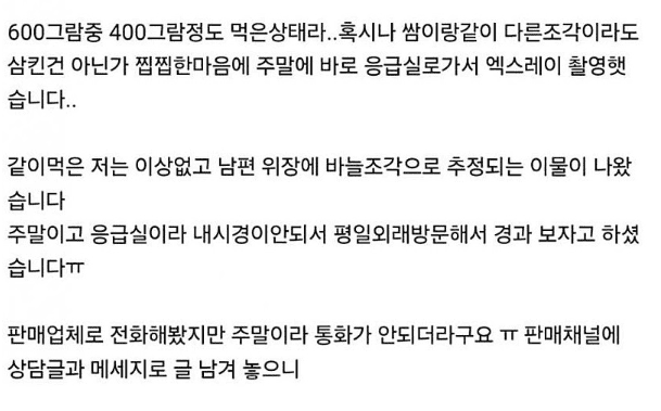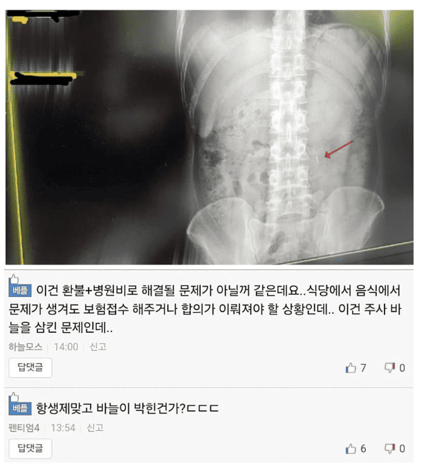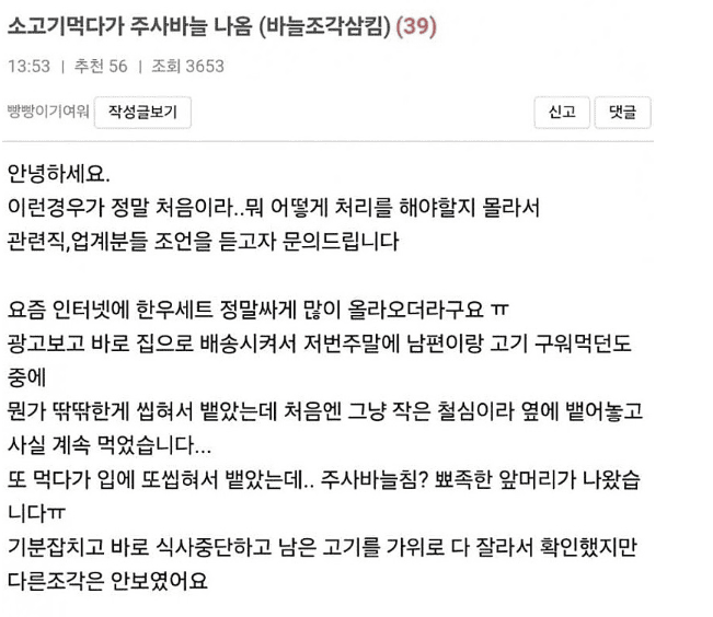소고기 먹다 주ㅅ바늘이 나옴..ㄷㄷ(+삼킴)