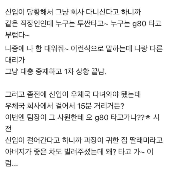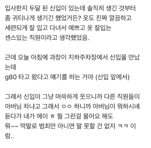 신입직원이 출근때 g80 타고 왔는데..
