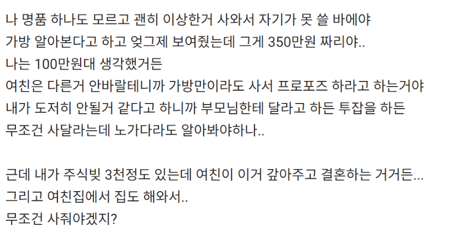 여자친구가 프로포즈 가방 350만원짜리 무조건 해달라는데 어떡하지..