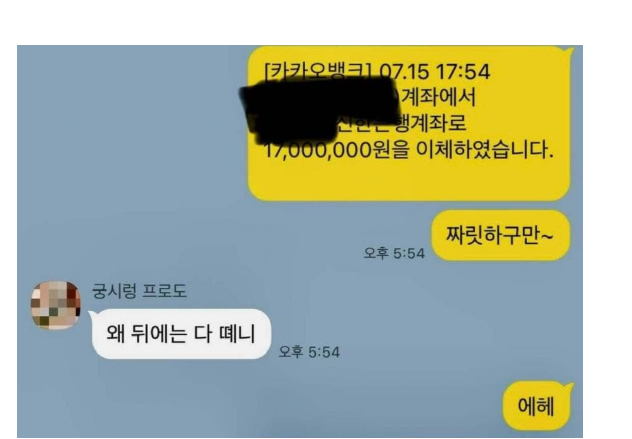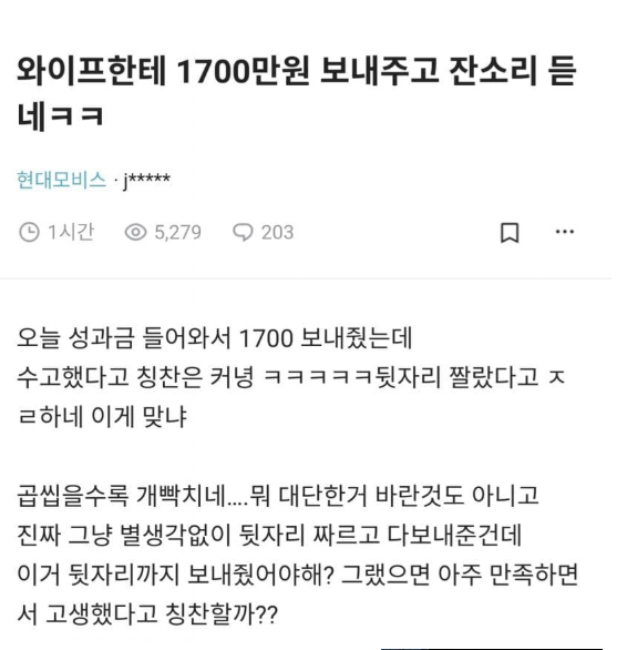 와이프한테 성과금 1700만원 보내고도 ㅇ먹은 남편..