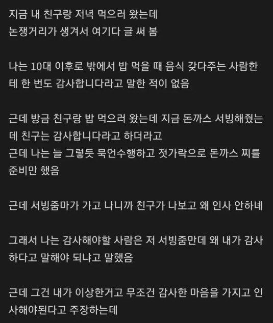 음식점 아줌마한테 감사해야 하는 이유를 전혀 모르겠음..