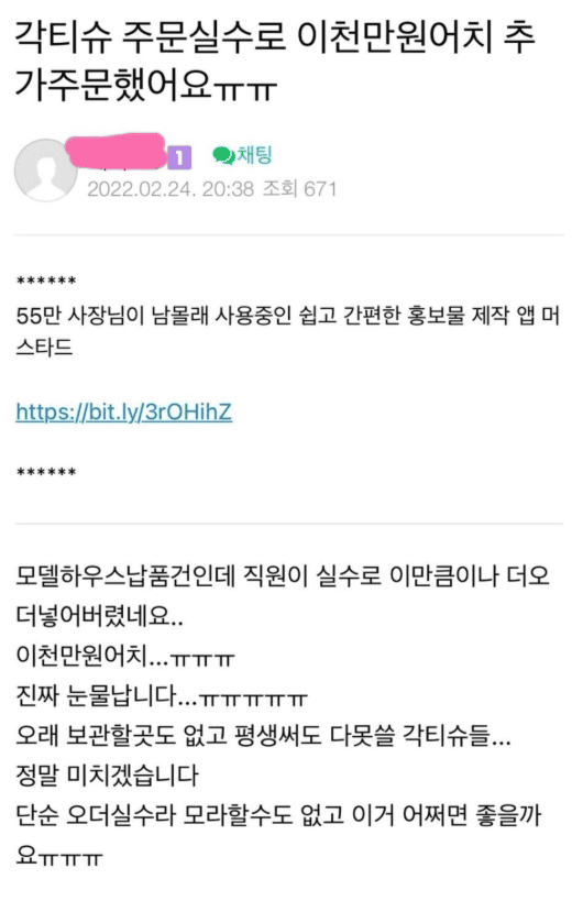 직원의 실수로 각휴지를 2천만원 주문했습니다..