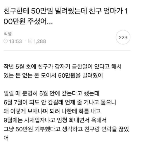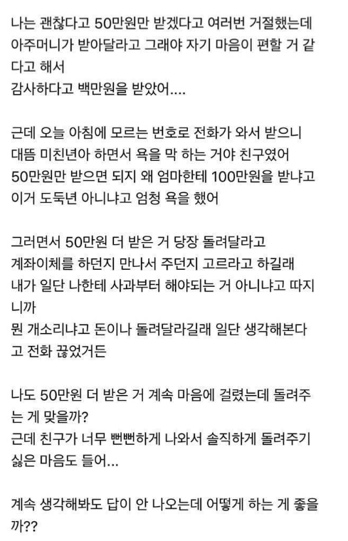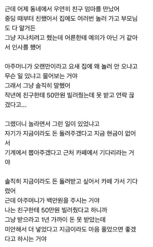 친구한테 50빌려줬는데 친구 엄마가 100으로 주셨어..