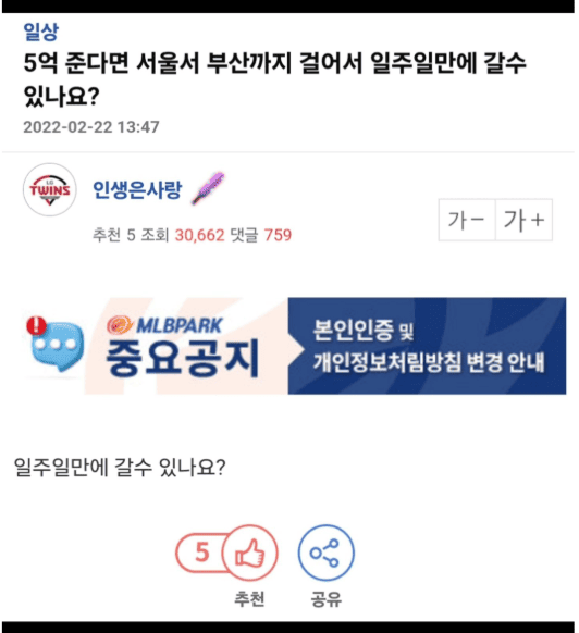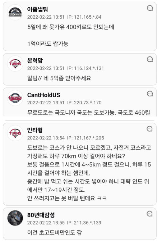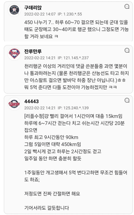 5억준다면 서울에서 부산까지 일주일만에 걸어갈수 있나요?