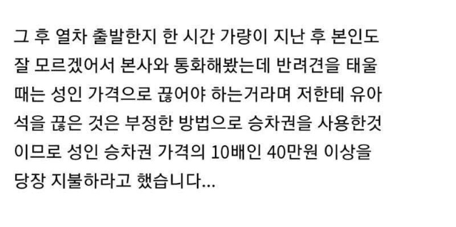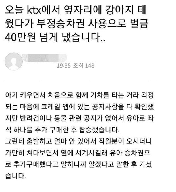 ktx 옆자리에 강아지랑 같이탔다가 40만원 벌금 냈습니다..