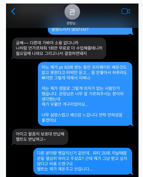PT 60회 이후 연장 안했더니 트레이너한테 받은 문자..